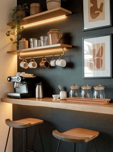Wooden wall decor adds warmth and elegance to the space.